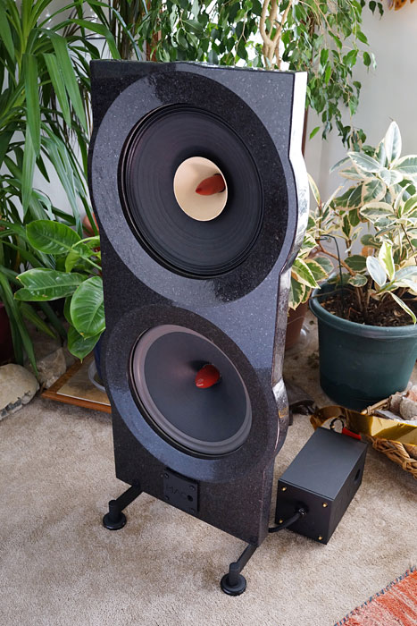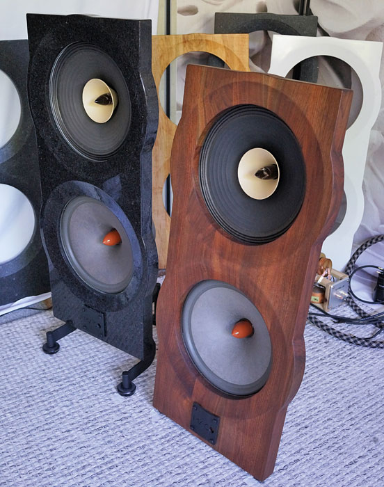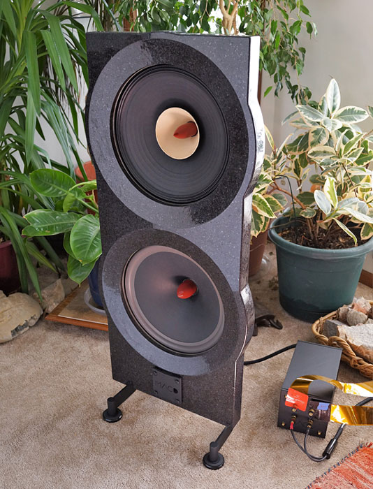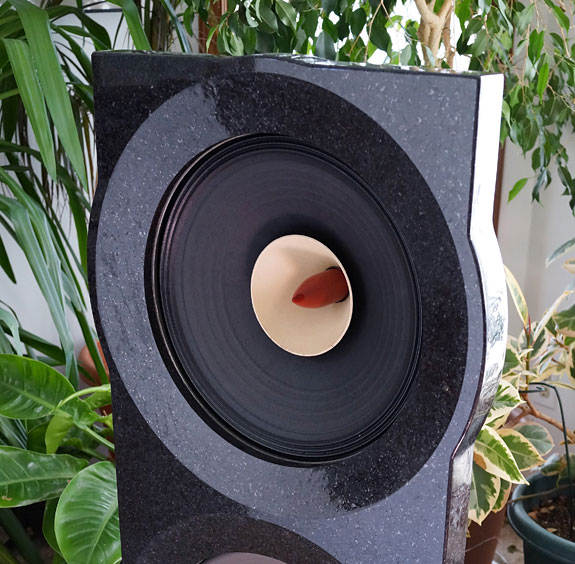 Thoughts On Design Unpolished granite is also an option. When I saw the polished version in Toronto I was a bit disappointed but having lived with it for weeks I've come to appreciate its elegance. The light plays beautifully on the beveled edges surrounding the drivers and flecks of minerals sparkle under light. The black Cambrian granite (anorthosite, from Saint Nazare, Quebec) is an igneous rock formed in the Precambrian era about a billion years ago. It disappears when listening in the dark with only a reading light aimed at my lap. With its formal look, the polished granite goes very well with the chrome metal on my Codia Acoustic Design equipment stand. The unpolished granite will have a more organic, natural, and casual look more befitting of a Massif Audio Design rack, for example. The granite, either unpolished or polished, is a neutral color that will fit many décor schemes. The standard quartz version is white, which is also neutral and applicable in many schemes whether you are going for contrast with dark walls, or a more monochromatic look for a more serene visual effect. Other colors of this metamorphic rock, which is also sourced in Quebec, can be special-ordered at extra cost, based on availability. The wood choices are solid walnut, ash, and maple as well as birch plywood. The wood plinths are available in a natural or gloss finish. Here again, the gloss look is more formal while the natural finish is more organic and casual. The birch plywood version can also be custom-painted in a color of your choice at an extra cost. The metal stands and exposed back sides of the drivers are only offered in black and the phase cones are always a reddish color as shown in this final production review sample. The available options allow for a wide spectrum of styles to create a very attractive listening room. Dusting off my interior decorator hat, I can say this is one of the finest designs available in North America today. The many photos on their website will help you visualize these possibilities.