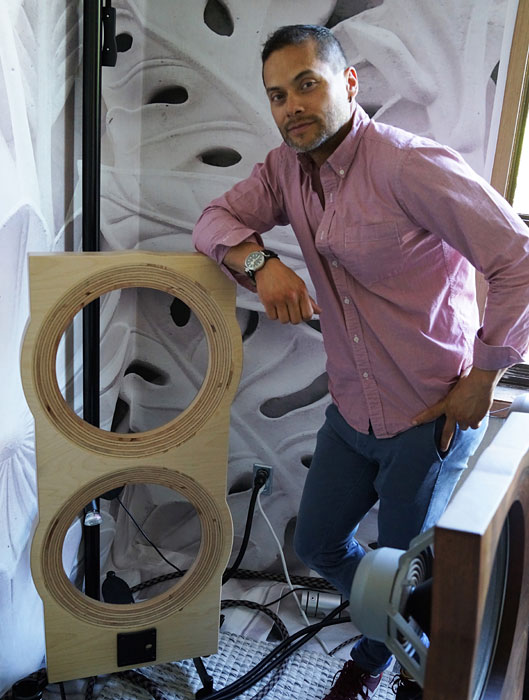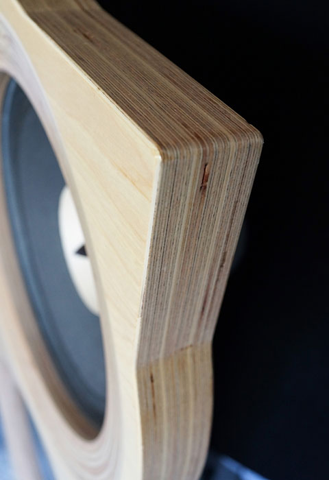 Near the entryway to the Hilton, an example of the birch plywood speaker with a custom red finish was a lot of fun. Very eye-catching. With a painted baffle you can take this speaker in any direction you wish. The plain birch version keeps the price to a minimum and gives it a casual look – both features that will appeal to many.