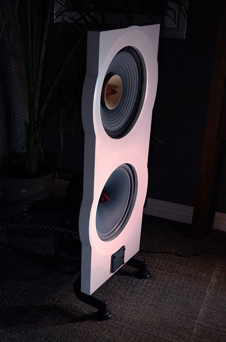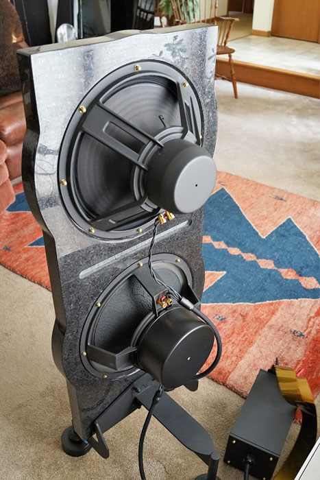 The separate, enclosed crossover and the wiring harness with the ability to bi-amplify the speaker are very functional, well-made, and easy to work with. Other open baffle designs have chosen to incorporate the crossover on the speaker itself and route the cabling less conspicuously on the back side of the baffle. That said, it didn't bother me at all, but I don't have kids or pets floating around the room. If it raises your anxiety, try a few black zip-ties and call me in the morning. The stability of the granite speaker with the floating base was very good. Casually bumping into it on my carpeted floor caused it to rock slightly but the resistance felt from doing so alerted me to stop moving in that direction. Intentionally bumping into it with the goal of knocking it over will likely be successful, but the same can be said for many other speakers. I never worried about it. The acoustic design of the speaker (aside from the obvious open baffle) is atypical in that it uses a full-range driver and a supplemental woofer that is crossed over at 300 Hz with a second-order crossover. Both are about 13.5" in diameter, measured from the front, and both feature paper cones. Frequency response is specified as 35Hz to 16,000Hz. The bass region down to just below 40Hz measured superbly flat as you might expect with my 30' long room. Below that, it rolled off nicely with 20Hz organ notes still being respectable when driven with an appropriate amplifier as I mentioned earlier. Bass-heads will delight with a bi-amping configuration that allows them to adjust the bass separately.