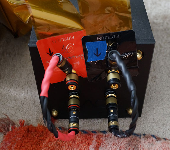Bi-Amp'ing With AGD And Eddie Wong Monoblock Amplifiers At the other end of the crossover are the dual sets of high-quality VIABLUE speaker binding posts that allow for bi-wiring as well as a set of VIABLUE jumper cables for use with a single speaker cable. Hooking up speaker cables for either single or bi-wire is very easy as the binding posts accept banana plugs, spades, or a bare wire, and they are well-spaced from each other. Furthermore, the entire crossover can be moved for easy access to the posts. Three optional VIABLUE vibration-absorbing footers (also used on the "Grounded Base" configuration of the speaker) were supplied on the review samples to elevate the crossovers a bit and provide traction for slippery surfaces. A standard footer is normally supplied.