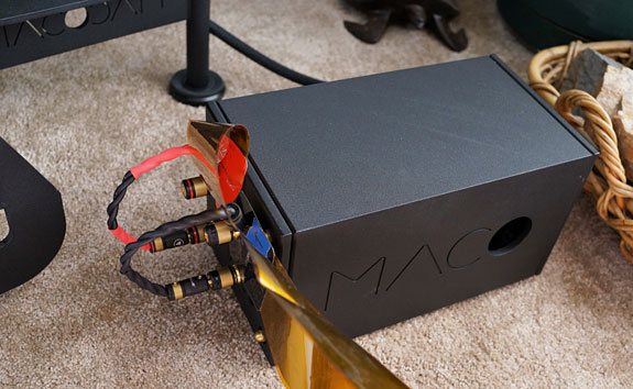 I hooked the Eddie Wong monoblocks with parallel 300B tubes up to the proprietary MACO M-15 full-range driver on top with the Silversmith Fidelium ribbon cable (16 Ga.) which is every bit as good as Greg Weaver claims in his review. For the proprietary MACO B-15 woofer below the full-range driver I used the heavier 12-gauge Synergistic Research Atmosphere Excite SX speaker cables with the AGD Audion monoblocks, which put out 200w into 4 Ohms. Since the input sensitivity of the AGD monoblocks is less than the 300B monoblocks, I had to install my vintage Musical Design SP1 preamp between the Backert Labs preamp and the AGD monoblocks to boost the level of the bass drivers. In doing this, the midrange on upward became more transparent and more resolved. This is a common consequence of installing a subwoofer. After balancing the bass, it was clearer and more resolved, as well as more taught and powerful. With the Synergistic Research power conditioner still in the red mode, the music became a bit warmer while still being high resolution. Combining a tube amp on top with a solid state amp on the woofers, there was a slight discrepancy in the tonal quality of the two frequency ranges but it was easy to overlook in comparison with the benefit of a deeper, stronger and more musical bass. "Master Tallis's Testament" rocked with the solid 20 Hz notes and the crescendos in this organ piece seemed to reduce the clipping of the 18-Watt tube amps that were now driving just the full-range driver on top. Of course, using an integrated amplifier between the Backert preamp and the speaker would have achieved the same end. This setup worked basically like a tone control, allowing me to adjust the bass level to my personal preference. Fun! An active external crossover would have been another solution, as would using two amplifiers with identical input sensitivities, eliminating the need for the additional preamplifier. The bottom line here is that bi-amp'ing makes a significant contribution if you are using a relatively low-power tube amp for the full-range driver.