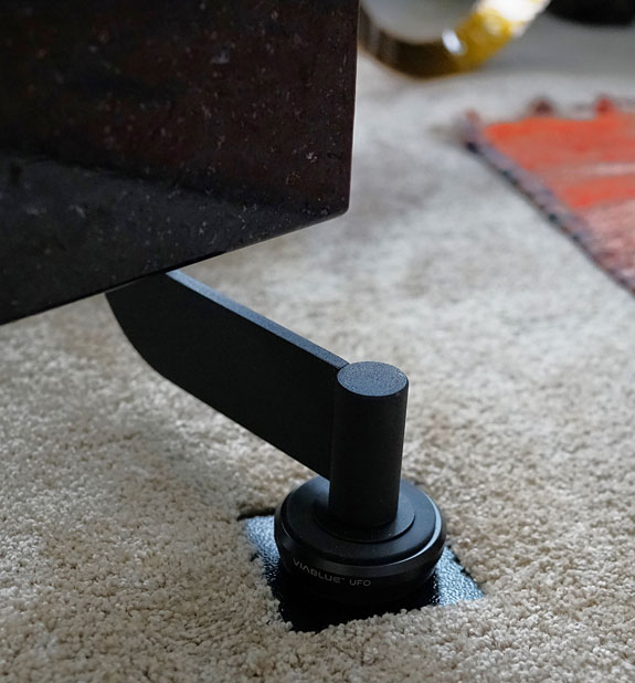 An irresistible "what if" struck me and I whipped out a bunch of my affordable, high-value Soundeck footers to try beneath the VIABLUE UFO footers on the Floating Base. It was an easy install so I tried both the small round version and the larger square version seen above. Normally, under spikes or against the bottom of components, the smaller round footers outperform the larger version. But this particular application was different with the large donut footprint of the VIABLUE footer. The most obvious improvement (though it was small) was in improving the resolution of the treble where cymbals in particular can become irritating when over-used by rock drummers. It is an affordable tweak that helped with the speakers on my carpeted floor. If you are on a concrete or wood floor, your treble may be sounding fine without any help.