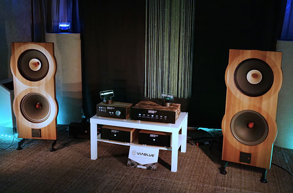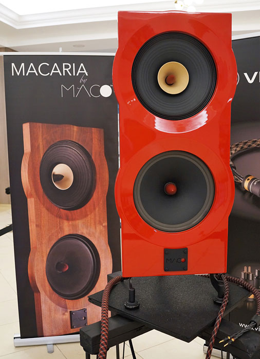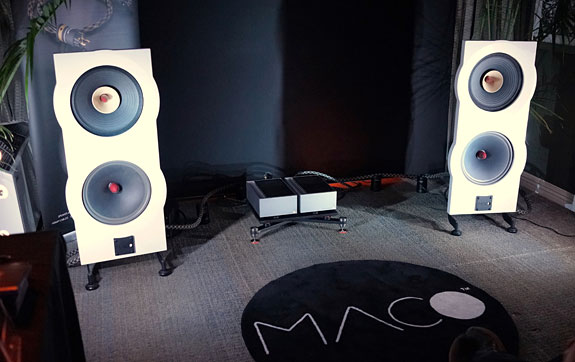 In room 609 a MACARIA with an ash baffle was shown driven by a rig with Geshelli Labs components. Because MACO has a strong relationship with VIABLUE cables from Germany, that was the brand used here. VIABLUE is also the cable used in the crossover and wiring to the drivers. These cables use silver-plated copper conductors. I've used mil-spec silver-plated copper in home-brew cables early on in my audiophile life and found them to be on the brighter side which helps to bring out the treble and improve the resolution. I would expect the VIABLUE with its excellent connectors to be considerably better than my home-brew cable but probably closer to my Synergistic Research cables with pure silver conductors than pure copper cables. When I reviewed the granite speakers at home, I pinched the baffle between my thumb and fore-finger to feel for vibrations. There was none. With the ash baffle, there was a very slight tingle, but it was nowhere as prominent as the baffle on a PureAudioProject speaker I heard elsewhere at the show. Still, the ash baffle was very solid but the music here was not as highly resolved as I had achieved at home. I attribute that to the much less expensive Geshelli components with their wooden chassis.