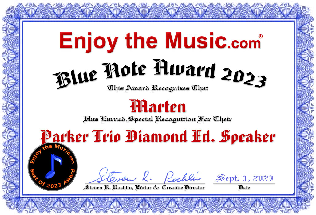 Marten speakers are designed and built in Sweden. Leif Marten Olofsson founded the company in 1998. Marten is now run by Leif Marten and his brothers, Jorgen and Lars Olofsson. Marten designs and manufactures five lines of speakers, all named to earn points from me; that is, they are named after American jazz musicians - Coltrane, Mingus, Parker, and Oscar. The fifth series is the Heritage Series, which has the sub-series Bird, Getz, Miles, and Duke. The Marten Parker Trio is a floor-standing speaker situated in the middle of the Parker series offerings. On its front baffle, it has two 7.5-inch ceramic bass/midrange drivers and a 1-inch "pure" ceramic tweeter, which in this model has been upgraded to diamond. Besides having a diamond tweeter, the upgrade to Marten's Parker Trio Diamond Edition floorstander also has upgraded crossover components, improved speaker terminals, and Marten's Jorma Statement internal wiring.