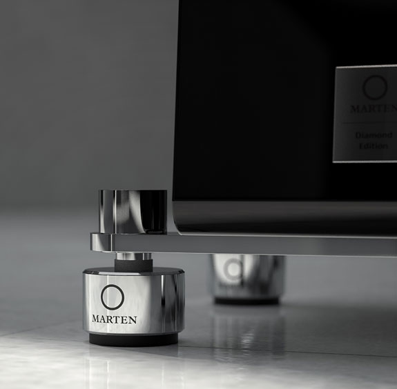 Leif Olofsson designed the speaker's ceramic drivers, which are said to have a long linear excursion and utilize a Neodynium magnet system. Jorma Design copper internal wiring is made by hand in Sweden. The Parker Trio's Diamond Edition's upgraded crossover was developed using a "multi-diverse crossover technique." After unboxing, I attached to the bottom of the speakers the outrigger system Marten designed to further reduce resonance by completely isolating the speaker's cabinet from the floor. In collaboration with the Canadian company IsoAcoustics, they developed Marten Isolators. Besides looking good, these high-gloss silver cylindrical footers lift the speakers another couple of inches off the floor. On their website, Marten says when the cabinet is wholly isolated, it reduces both resonance and distortion, "leaving the soundstage free." More sonic benefits, according to Marten, are "a more dynamic bass with increased power and control, a natural openness and clarity."