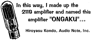 Ongaku For The Rest Of Us But wait... because Kondo-san was gracious enough to share his design with the international experimenter community. we can build our own 211 SE amps based on the Kondo masterpiece. Of course, we can't build a real Ongaku -- part of the celebrated sonic magic of the amp is in its exquisite material execution and the special virtues of in-house Audio Note parts. But I'll bet the Kondo circuit will turn in a respectable performance even when more pedestrian materials are employed. Until the Sound Practices publishing empire hits the "big time", I'm afraid I must settle for second best when a savings of $60,000 is involved. Some interesting components are available from Audio Note, UK which would be appropriate for a "Poor Man's Ongaku" project. including single ended transformers for the 211 and a line of oil/paper coupling caps. A primary mission of the Audio Note UK operation is to make some of the findings, of Kondo's uncompromising explorations available to the audiophile who isn't blessed with an Ongaku-sized budget. Toward this goal, they are developing a line of lesser-priced equipment of high musical achievement along with providing a selection of music quality parts for fellow audio adventurers. OK, homebrewers... time to get those soldering irons "in the heated state", as Kondo-san puts it. Next time: my report on "Building the Poor Man's Ongaku" and more on this interesting design.
