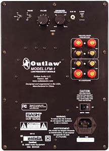 The Outlaw sub's rear panel features line and speaker