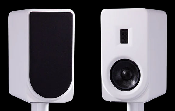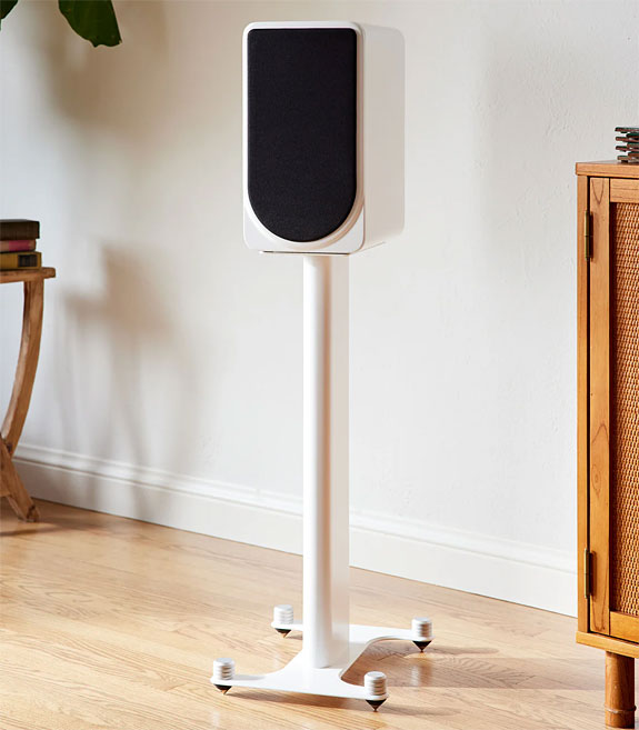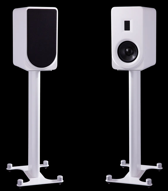 PS Audio provides four jumper cables, two for each speaker. Without the jumper cables, you can use all four of the binding posts for bi-wiring or bi-amp'ing. Drivers within the FR5 include a 2.5" planar -magnetic ribbon tweeter with a Teonex diaphragm. ("I love ribbon tweeters."). The woofer is a long stroke 6.5" diameter cast frame driver made of ‘Curv' woven polypropylene. The motor has a split-gap magnet structure using dual Faraday rings. The crossover is constructed with custom-made film capacitors and high-quality air-core coils. The air core and film cap crossover are designed as a 6th-order Linkwitz-Riley filter; with the crossover frequency being 1.75 kHz. All this innovative technology comes at a price of $3500 per pair. PS Audio's Aspen FR5 monitor speaker stands add $500.