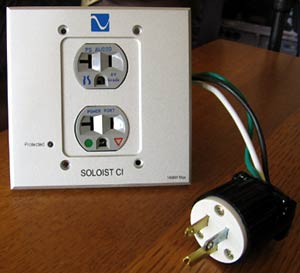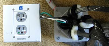 The Methodology When it finally arrived and I opened the box, I was surprised to see how large and substantial the Soloist is. The down side to all this beef is the fact that it does not fit directly into a standard outlet box, but requires a double gang in-wall junction box. A blue plastic double box is included in the package, but still, it means some cutting of wallboard and a permanent installation, unless you already have a double box in your wall. This is not what I had in mind for review purposes, so I went to Plan B. At my local electrical supply store I bought an industrial grade plug for the three wires protruding from the Soloist that would normally connect to your house wiring or dedicated line. Permanent installation would be done with the supplied wire nuts, as long as your wiring is copper, not aluminum. By installing the plug, I would then be able to compare the use of the Soloist with my standard 15-Ampere house wiring, 20-Ampere Romex dedicated line and the 30-Ampere JPS Labs dedicated line without tearing my walls apart. I could easily swap back and forth between the three electrical circuits.