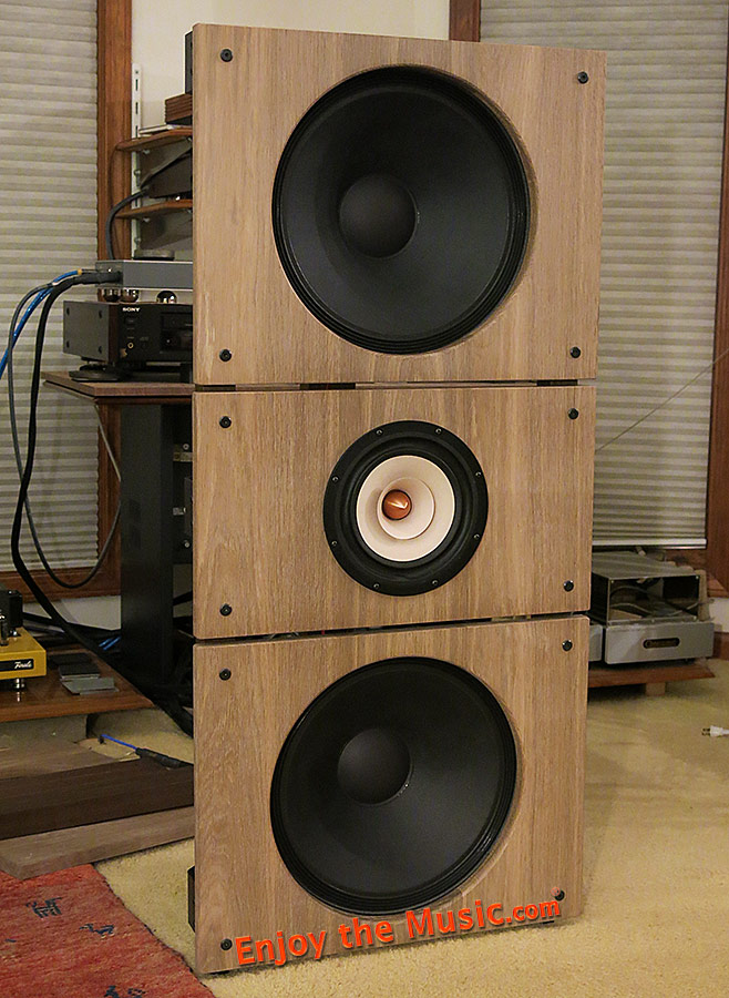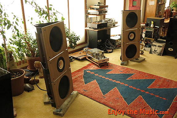 Listening I started out with the Triode Lab Finalé F138-FFX Vacuum Tube Integrated Amplifier that puts out 6 wpc in Class A using EL84 tubes. The sound was lovely at very modest listening levels but the speaker would just not get up and boogie. So I stepped up to a new integrated amplifier from Eddie Wong under a new banner, Magic Tube Research, that seemed to have a much stronger bottom end with power coming from a pair of EL34 tubes, again in Class A. This amp allowed me to take the Trio 15TB up another notch, peaking at over 90dB at the listening position, but in my 6000 cu.ft. room with openings to adjacent rooms, this was still not enough power to bring the speakers to life. Finally, I rolled out my "big gun," Coincident Technology's Turbo 845SE integrated amp. I say "rolled out" because at 85 pounds I decided it was healthier to build a rolling amp stand than to risk lifting this beast every time I wanted to use it. (As a point of reference, your sofa probably weighs about 85 pounds.) Furthermore, the Turbo uses a single Psvane 845 tube per channel to put out 28 watts, each side. Sure enough, the PureAudioProject Trio 15 TB sprang to life, capable of punching out peaks at 98dB on all but the most difficult musical passages. Particularly noticeable was the bass that tightened up, extended deeper and became a lot more dynamic. I played with the speakers aimed just to the side of each ear and again with them aimed straight ahead. There was a considerable difference which Tom quickly picked up on when he came to listen. The tonal balance is out of whack with the speakers aimed straight ahead. The bass is too prominent and the midrange and highs fall off, indicating the full-range Tang Band W8-1808 driver with its aluminum phase plug and whizzer cone is relatively directional. What I liked about the sound with the speakers aimed straight ahead was the greater soundscape that reached into the far back corners. But there was obviously better focus, more even tonal balance and better transparency with the speakers toed inward. In your own room, you will have to play with this, particularly if you place the speakers on the short wall where side wall reflections will come into play, unlike what happens in my situation. With the fixed location of my dedicated lines, it is not very convenient for me to alter the speaker orientation in my room.