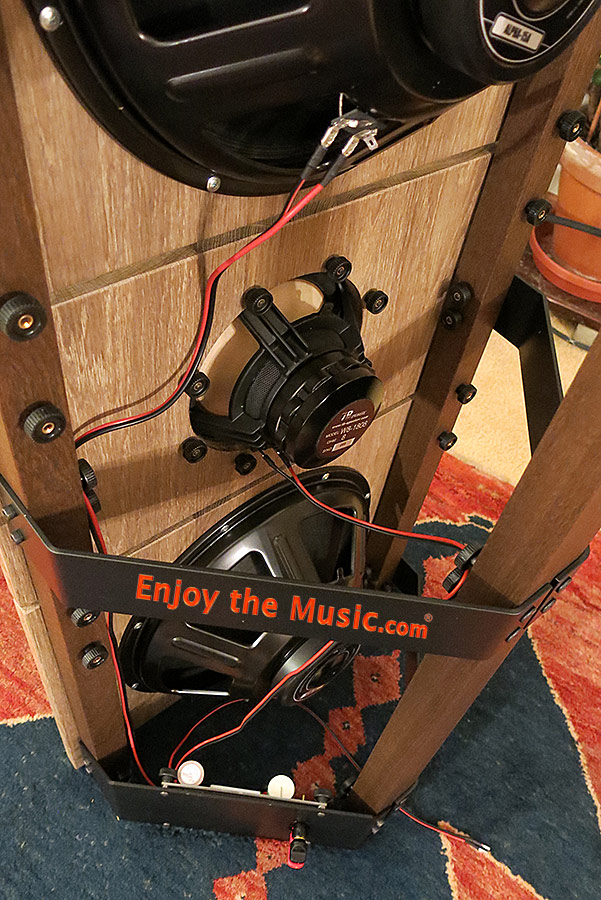 Open baffle designs, like planar designs, need to be placed out from the wall behind them in order to effectively couple with the room. During break-in, I had the front baffle about 45" (115cm) from the front wall and it didn't work well. Bringing it out to about 63" (160cm) the magic began to appear. Center-to-center distance was about 86" (~220cm) between the speakers and a speaker-to-ear distance was about 94" (~240cm). This is roughly an equilateral triangle of mid-field size. The speakers were placed on the long wall of the room with side walls far to the left and right of each speaker. Many people would choose to put these speakers on the shorter wall of their room and sit a further distance away. The low position of the full-range driver would be less critical in such an arrangement. In either orientation the large baffle largely hides the pillars and the metal struts, as well as the backsides of the drivers when seen from the front. The backside was not completely hidden when entering the room but the baffle grabs your attention quickly enough to largely ignore the complexity of the drivers and wires. After the first week I didn't pay any attention to the exposed sides. If your spouse remains fixated on the back side, some formal psychoanalysis may be in order. Speaking of wires, the crossover can be mounted on either the left or right side strut at the bottom of the PureAudioProject Trio 15 TB speaker, which may facilitate having your power amp located off a bit to one side without requiring unusually long speaker cables. At least it gives you a foot or two of flexibility. With the wires going from the crossover to the drivers I was able to use the knobs holding the structural bolts to keep the wires from crossing one another and channel them somewhat out of sight. I also took the liberty to ignore the instructions and put the knobs on the back pillar on the "inside" of the speaker so they could not get "hooked" on a person's clothing when someone was maneuvering about the speaker. This brings up another point about the stability of the speaker. The speaker is tall and the footprint is small. A triangular column is more easily tipped over than a rectangular column. And since the mass of this speaker is low (relative to a fully enclosed speaker of this size), it could be easily toppled by a tiny dancer. In a sedate, adult listening room it was no problem, but in a free-wheeling party environment, particularly with the speaker angled back, there is a liability. Installing the feet on outriggers to enlarge the footprint and increase the stability should not be difficult for the company or even as a home modification by the owner.