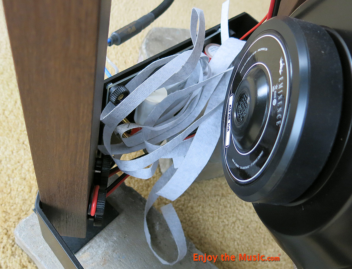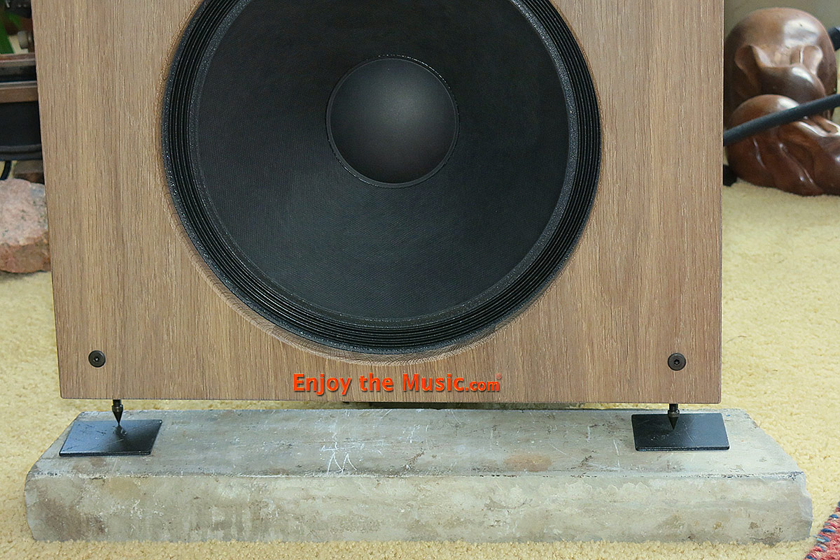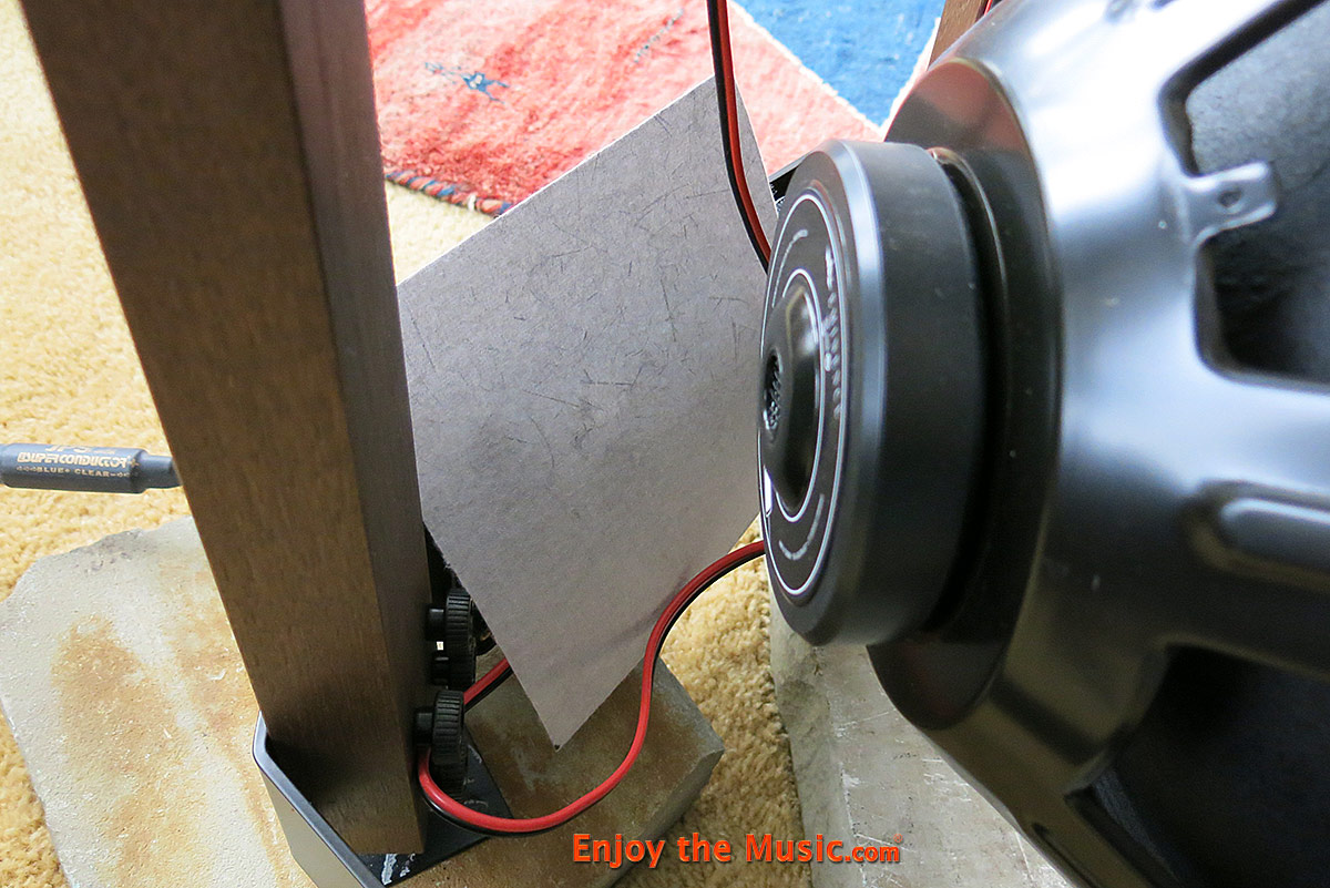 The speakers were supplied with feet that swiveled and had a smooth flat surface to protect a hardwood floor, but on seeing photos of my room with broadloom carpeting, Ze'ev rushed me a set of pointed spikes which pierced the carpet and improved the sound considerably. Even greater improvement was achieved by placing SoundDampedSteel IsoFeet squares under the spikes as I normally do. Eventually, due to the mid-field listening distance and the perceived need to raise the speaker higher in addition to tilting them back, I used 2.25" (~6cm) thick slabs of architectural slate to raise them. A 3" or 4" lift might have been even better in my case, though this will depend upon your listening distance and the height of your ear in your favorite chair. The result was certainly worth the effort at the time and the expense is minimal, depending on the material you select. The grey slate blended nicely with the smoked oak finish.