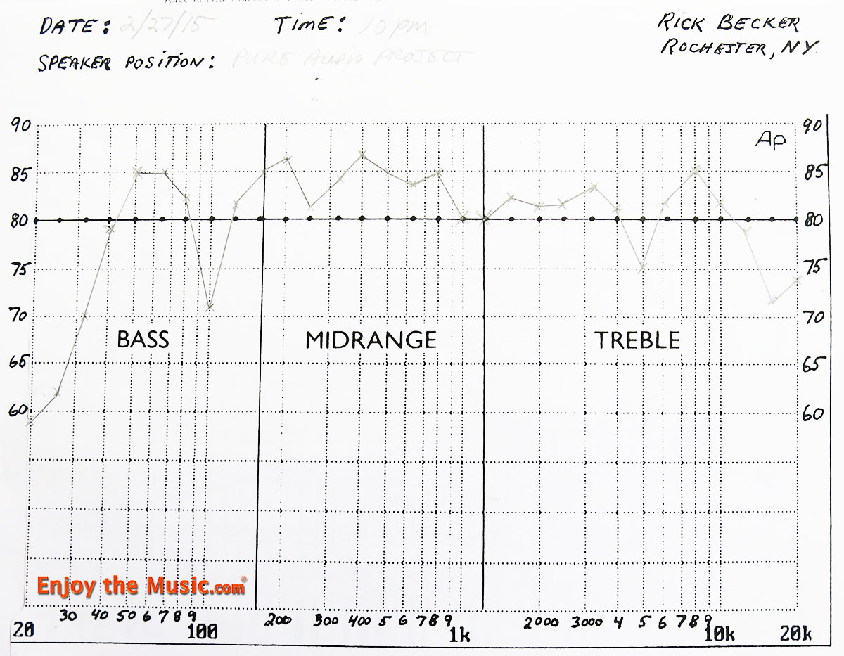Good Vibrations? It occurred to me that perhaps I had over-tuned the speaker early on when it was still breaking in. So I slowly deconstructed my speaker set-up. First I removed the SoundDampedSteel Isofeet from beneath the spikes, which proved to be a step in the right direction. Next, I removed the slate risers, a move that extended the decay of the notes further and warmed up the sound. And finally, taking a clue from Synergistic Research MiG domed footers; I replaced the rear spike with one of the original swivel-headed footers with a non-penetrating surface contacting the floor. This, too, cut down the focus a bit and extended the decay, finally making the Trio more musically inviting. Next I tried two of the flat feet at the front and a spike at the rear. This was better yet, but after thinking about it, the next day I re-set the speakers with three flat footers. This not only increased the decay of the notes, but it increased the bloom of the instruments. The music had swing. My foot was tapping. I was emotionally involved with the music. The space between the notes had shrunk and the bass had picked up a slight, but noticeable softness. As Zen masters and a few Westerners since then have said, it's the silence between the notes that makes the music, and this is what I've altered. On music I've heard a hundred times I felt a fresh wave of goosebumps and a re-play of Vincent Belanger's "La" brought tears to my eyes. Another consequence of softening up the bass with the use of the three flat footers was heightened awareness of the limited reach of frequency of the dual 15" drivers. To look at the PureAudioProject Trio 15 TB open baffle speaker you would think they must reach really deep into the low bass, but no. This is one of the limitations of open baffle design. The Eminence drivers are very good down to their free air resonance (Fs) of 41Hz as shown in my SPL chart, but below that they fall off quickly, which is to be expected. I fell asleep late at night, wondering what the Trio would sound like with my pair of Tekton subwoofers with dual concentric 12" drivers.
