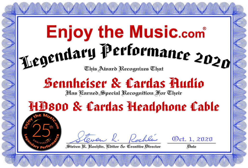 Like all the very best components, the HD800 doesn’t favor one type of music over another. It excels in solo piano, pop, jazz, folk, chamber music, opera, spoken voice. In fact the only area where I cannot tell you it does really well is country music. Poppa don’t allow no country music ‘round here, so I have no evidence one way or the other. Are they worth the price of admission? A resounding yes, just as the Ultimate Ears UE-10Pro and AKG K701 before them, my previous references. They win for sound quality, comfort and superb physical design. But before you rush out to buy them, I have one caveat. You won’t get the kind of performance I’ve been talking about out of the box. You won’t get it by running them in for several hundred hours either. You’ll only truly hear what these babies are capable of if you replace the nice looking black mesh covered cables with some suitable after market replacement cables. It’s a similar story with many components you buy – the power cord that comes in the box doesn’t tell you the full story. I tried a new replacement cable from George Cardas at Cardas Audio, a simple plug in replacement which makes a world of difference. Other vendors have their own upgrades available by now, but I can only vouch for the Cardas cable. Throw in the cable upgrade and you’re going to need to lay out over $1600, but there’s no speaker that can touch them for much under ten grand, so they’re a screaming bargain.