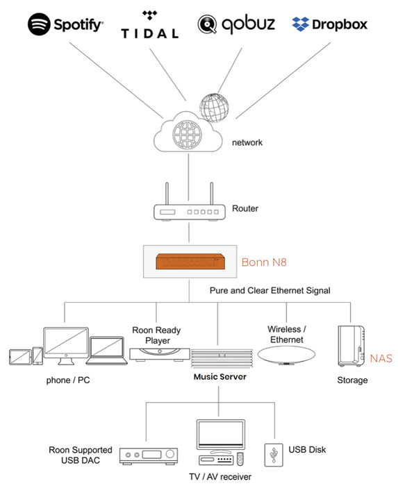Thunder Data, the primary company responsible for the Silent Angel products was founded by two Chinese research engineers – Dr. Huang Jian and Chorus Chuang – specializing in both hardware and software development and engineering, and they have several patents in this field. Features of the already highly-regarded Bonn N8 eight-port Ethernet switch, which sells for £399, include fully balanced input and output transformers for every port, though it must be said that pretty much all such network connections are done this way even on low-cost Netgear switches. Further additions include damping pads on many internal components to reduce induced jitter from audio-related vibration, and the use of a low-noise high-stability reference clock to upgrade it to an audio-quality computer network switch. The eight ports are 100/1000Base-T gigabit specification, and the design includes a customized 'Silent Angel Noise Absorber' with two EMC filters for the main internal power supply and a further two for the clock generator circuit. The included switched-mode power supply is specified as medical-grade for lower noise and leakage current.