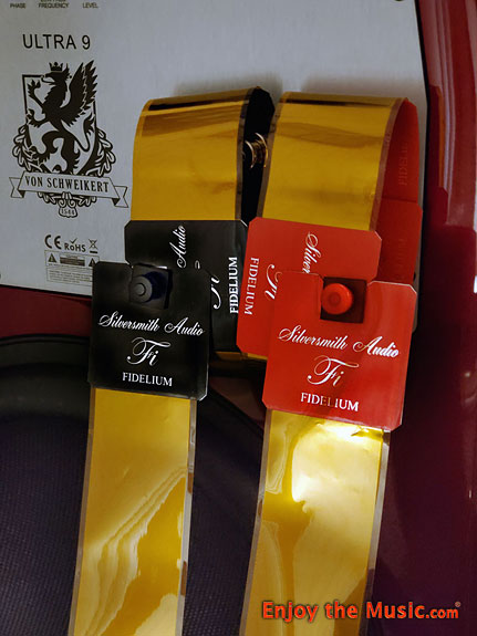 Now, let me give you the rundown on the in-house cable line up used to compare and contrast the performance of this new Fidelium 8-foot single wire set. First, my long-time reference speaker cables use a highly specialized combination of ultra-thin and ultra-pure copper, silver, and carbon fiber conductors in combination with a flat, spiraled solid silver conductor, has both Teflon and a lighter-than-air Nobel gas as the dielectric, is assembled in a proprietary non-resonant distributed LITZ configuration construction geometry, using solid silver terminations, and is hand-made in the USA. At some $18,000 for its 2.5-meter length, they have never been bested by any contender over their six-year reign. I also have on hand the following, all properly run in, and – re-conditioned regularly – on an Audiodharma Cable Cooker. A flagship Japanese single-wire set employing a large aggregate gauge populated by a unique Single-Crystal Copper alloy, and exotic insulation and dielectric materials. That two-meter set sells for $11,000 and change. Then there are the latest flagship bi-wires from a USA manufacturer that feature a mix of Ohno Continuous Cast Copper and silver-plated copper conductors using a completely different geometry strategy, and that 2.5-meter set retails for $10,500. Then too, I have that same company's previous flagship bi-wires, employing only the OCC conductors in a differing geometry, with that 2.5-meter set selling at about $6000 a set. Finally, I have a second-of-four tier set of bi-wires from a very well-reviewed USA manufacture that sold for about $6000 a set as well. There are others...I have a rather full cable stable here. I know, but as a reviewer, I feel I can justify it. Why all that elaboration; why not just name the company and model? It's simple really. As a responsible and conscientious journalist, I have no interest in impugning or in any way belittling or minimizing well-regarded products from other manufacturers. My role is not to damage anyone, but rather, to spread the word about the best available in our industry. Those of you who may be new to my work should know that I've become somewhat of a recognized and acknowledged expert on cables and their sound. I established myself early on as a reviewer in the late 1980s with my magazine, wherein I first published a rather complete treatment on "Loudspeaker Cables: Simple Passive Connection or Complex Dynamic Component." Now seen as an early milestone work regarding cables, one recognized by many industry leaders as a reference on cable designs. My Von Schweikert Audio ULTRA 9's are meant to be bi-wired, so when I dropped the single set of Fidelium's Jeff had given me into play, cold, right from the box, replacing my $18,000 long-time-reference cables, I continued to use the most accurate set of binding-post jumpers in house.