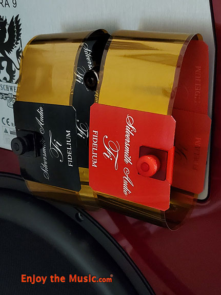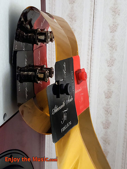 As soon as the Fidelium jumpers arrived, I pounced on their installation. I was intrigued; these jumpers are unique in that they are a pair of single ribbons, about a foot each in length, with a notch and the applied termination labels on each end. But they have another "termination" at the midpoint of their short running length. This one faces off to the side of the ribbon and includes a nylon threaded clamping adapter. You mount the separate polarity ribbons, in the shape of a C, between upper and lower binding post, with the bare termination connection side of the notched ribbon section against the speaker side of the post. So, you connect it extending upward from the top set of binding posts, then let it curl downward past the bottom set of binding posts, where you turn that other termination back up and connect it from below the lower binding posts. From the side, it looks like a C. Once that C connection is made, you attach the respective positive or negative ribbon coming from the amplifier speaker outputs to that central termination and clamp it down with the nylon adaptor. See the included photos. So, not only is this utter simplistic genius, the result is monumentally effective. Such a connection actually terminates the single ribbons at both sets of speaker dual binding posts at once rather than connecting to one set, and then "jumping" to the other, eliminating the involvement of the first set of binding posts. Did I mention Jeff was a clever cat? So, once these ingenious connectors (I'm loath to call them jumpers, after all) were installed, and the now fully conditioned Fidelium cables were reattached, I fired up the system and - my jaw dropped! At this point, there simply was no doubt that my $18,000 flagship set of cables, cables that had reigned unbeaten by any and all challengers within my current system for the past six years, were for the first time seemingly being bested. I say seemingly because it was difficult for me to admit. Part of me, a specific slice of my persona, the prideful owner of these flagship loudspeaker cables, took over. That dogmatic voice was saying to me, "This has to be a mistake, switch them back and you'll see." And so, over the next two-and-a-half weeks, with something like fifty more swaps back and forth between my reference cables and the Fidelium's, the music lover in me finally took control and sent the prideful persona packing. It was about the tenth time that the music lover persona's voice said, "How many more times are you going to swap these cables, only to hear the same results, before you just admit that you have a new reference cable on your hands? What will it take to get you past that stigma and admit to yourself, and your readers, that this is a game-changing product?" that it sunk in.