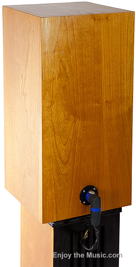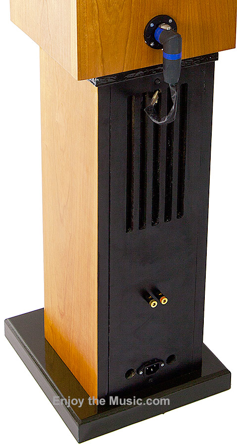 Stand Mount The new buzzword is stand mount, which is more approximate than bookshelf loudspeakers. I do not know of true bookshelf loudspeakers that actually sound better in a bookshelf. Do you? All small loudspeakers sound best properly mounted at the ideal height and ways from the front and sidewalls. In this case, the stand mounts for the M2A are powered. The M2A woofer plate amplifier is in the stand mount. It handles the woofer up to 1 kHz, which is the crossover frequency to horn. It is not user adjustable like a sub-woofer, because AJ says that would allow change frequencies in the lower mid to horn transition (greater than 800 Hz), which is undesirable. "So the amplifier is "hidden" in the stand, with no possibility of user maladjustment." As with everything AJ does, the cable from loudspeaker to amplifier is not quite normal, but it is well thought out. The cable is also unique. It is a Speakon connector cord, mostly used in professional audio systems for connecting loudspeakers to amplifiers. The male connector is a large round pin, with an interlocking button. "It is foolproof. No chance of reversing polarity, or shorts, like you have with dual bananas." The Speakon connector is a very solid connection. It cannot connect in any other way to any other component in a home theater music and movie reproduction system, except another Speakon connector. Therefore, the M2As are an active version, which must be
