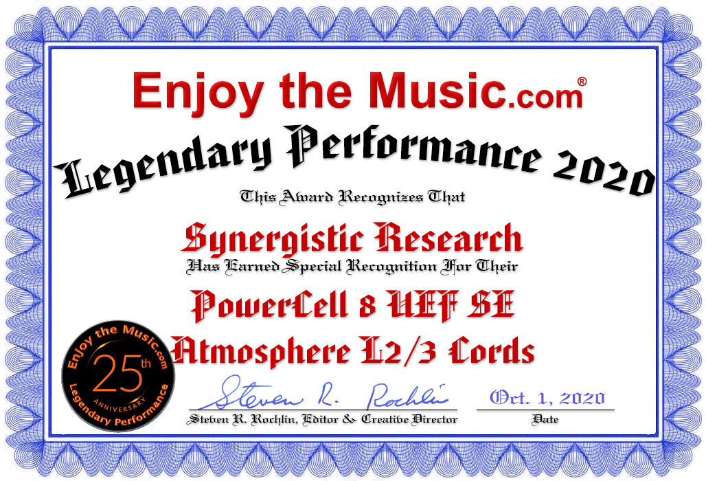 Value In saying that, I feel like I'm echoing my own comments on the Codia Acoustic Design Stage 3000 BAB Audio Rack I reviewed last October. At $5260, it was not a small ticket item, either. Like the Synergistic Research products here, it raised the resolution to that top tier, more than justifying its price. This presented an obvious question. To answer it, I tore out my home-brewed equipment rack topped with a Panzerholz shelf and installed the Codia to see if the improvements wrought by the PC8 and power cords would mask the improvements contributed by the Codia rack. As seems to frequently happen with gear designed to improve resolution and transparency, the combination was... well, synergistic. No bleeding edge notes pierced the night air. Shakey Horton's screaming harmonica on American Folk Blues Festival 1970 sounded like the real thing and the crystal in the dining room didn't shatter. The rig seemed pretty close to perfect. The primary shortcomings were the limited depth of bass response (about 33Hz) which can be addressed with subwoofers, and the absence of great slam, which would require more than the 18 pure Class A watts of Eddie Wong's SET monoblocks. Frankly, I don't think I want to give up the gorgeous tonal color and three-dimensionality his amps provide. And I'm not a head-banger. I've learned something here. The Kharma Ceramique 2.2 speakers have been my reference for fourteen years now. I've been suspecting they might need replacement. First the Codia rack and now the Synergistic Research PowerCell8 and four Atmosphere power cords have shown me that I've yet to reach their full potential and I don't need to spend anywhere from $10,000 to $30,000 to replace them. For my system, in my room, these Synergistic Research upgrades represent an extreme value, bringing out the very best I've experienced from my components so far. That the products reviewed here surpass my other Synergistic Research products of only six years ago by such a wide margin attests to the fact that this entire category and Synergistic Research in particular, is making enormous progress through their research and development. I mentioned their recent expansion to a new facility earlier and their investment in more efficient production equipment has not only advanced the technology they offer, but made it more affordable. If you can't afford these particular models I've reviewed, or if they are not appropriate for the level of gear you currently own, there are models below these that may fit your needs. The PowerCell 12 UEF series above the one here approaches the performance of their previous ultra-high-end Galileo series. That series has recently been re-engineered as the Galileo UEF level for the very wealthy. As I've written before, this is not a company that is standing still. They are on a creative roll and appear to be having a lot of fun and success doing what they do. Nonetheless, research and development costs money and those costs must be passed along to enable future R&D. It should be easy for you to prioritize your purchasing decision between the PC8 and the power cords. The PC8 UEF SE benefits the entire system for $2995. The Atmosphere Level 2 and Level 3 power cords at $1995 and $2995 respectively, will enhance a single component. If that component is at the front end then the benefit will flow through the chain. Look at what you have in place already and figure out where to invest if you can't go for everything at once. $2000 or $3000 sure seemed like and expensive add-on to a $5000 line stage and a $2000 DAC and it didn't make any sense to me until I heard it for myself. Once everything was fully burned-in there was no going back.