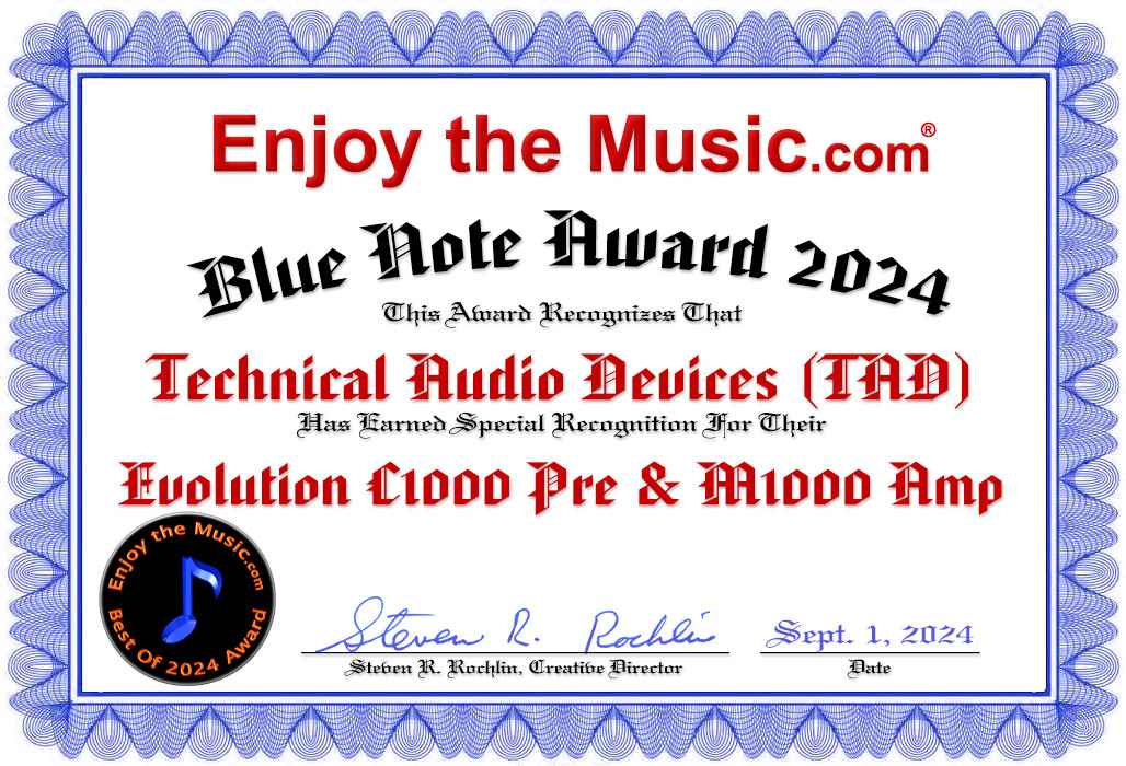 Conclusion Suppose one decides to purchase one or both of these components. In that case, I hope the new owner of these components can concurrently donate to an organization that helps those less fortunate than this well-off (or very passionate) audiophile. If one cannot find an organization to donate to, I would be happy to suggest one. Most audiophiles are aware that although these two components are expensive, they are relatively inexpensive components on the market. This includes many components made by TAD. Despite this, the TAD M1000 power amplifier and C1000 linestage are two of the best solid-state components I've reviewed or have had in my listening room for quite some time. Yes, one could spend more, but I highly recommend auditioning both TAD components before one does. Their top-notch "fit and finish," bulletproof construction, good looks, and outstanding sound quality earn my highest recommendation, and in September both will inevitably be nominated for an Enjoy the Music.com "Best Of 2024 Award."