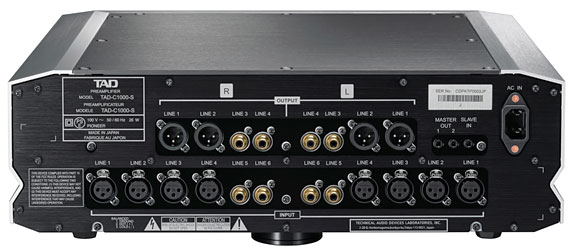 Weight The C1000's heft is also possibly due to its spiked feet constructed from chromium-molybdenum steel and its matching adjustable spike holders made of "special" steel. The sonic advantages of reducing the amount of area contacting the component contacts the surface on which it sits are well-known, and the sophisticated method that the C1000 achieves this is a testament to the design expertise of TAD and the solidly built construction of this linestage. The arrangement of the TAD C1000's rear panel is evidence of its dual-mono design. On one side of the rear panel are the inputs and outputs of the right channel, and on the other the inputs and outputs from its left channel. The C1000 has four balanced (XLR) inputs and two unbalanced (RCA) inputs. There are two balanced and two unbalanced outputs.