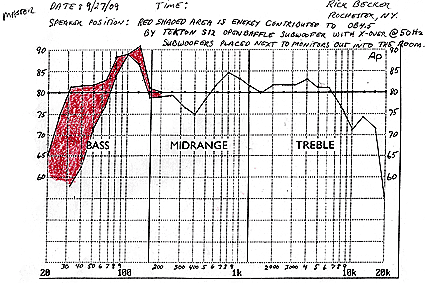 Fine Tuning I adjusted the crossover down to 50 Hz and pumped the volume up to maximum. The measurements of this adjustment are what you see here with the difference between the monitors + subs and the monitors alone shaded in red to give you an idea of the energy contributed by the subwoofer. More than producing a better looking curve at the low end, minimizing the overlap of the sub and monitor cleaned up the mid-bass, improving the focus even further in that region. Increasing the volume gave me a stronger bass response than to what I was accustomed. The stronger bass sometimes buried the vocals in the midrange deeper into the music. For several late night/early morning hours I revisited key recordings, reveling in the qualitative improvements and getting accustomed to the stronger deep bass. The fine tuning made a great sounding musical presentation even more outstanding. The hump in the upper bass region is a room node which doesn't bother me since it has been there with every piece of gear I've reviewed. I'd probably think something was dreadfully wrong if I installed a room correctional device. The important thing here is the bass below 70 Hz was dramatically improved.