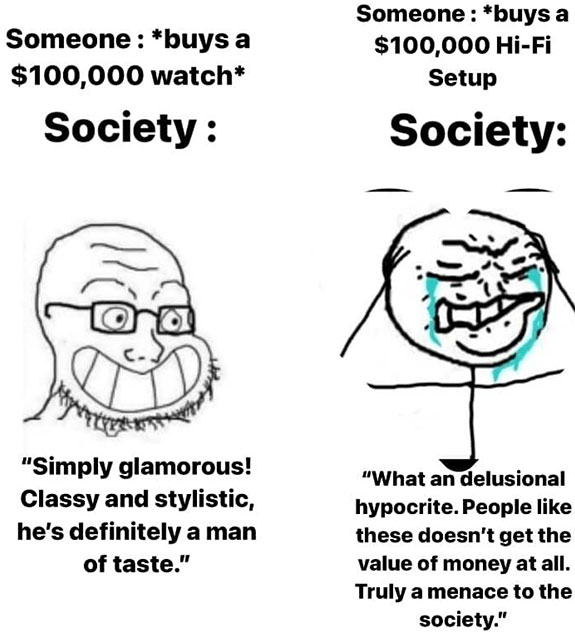 Obviously, it's not the "to-the-second" accuracy or the road-burning speed that the people who buy such things are willing to pay the extra money for. So, what is it? I think it's something far more valuable: Either how the purchase makes them feel about themselves or what they think other people will think of them (or how they hope those other people will respond to them) if they buy the upscale items in question. And that's where that cartoon comes in. It expresses, using a different example, something I've long believed that if you buy a Lamborghini or some other hugely expensive car, people will think youre crazy but will secretly envy you and wish that they were you, but if you spend that same amount of money on a high end audio system, they'll just think you're crazy.
