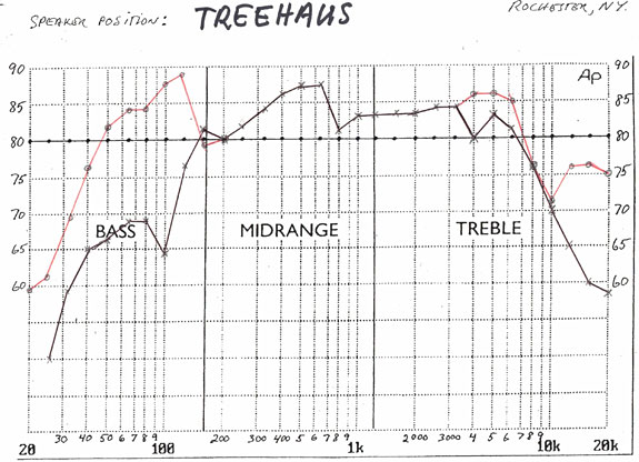 After listening for a week with only moderate enthusiasm for the speaker I pulled out my Radio Shack SPL meter. I simply wasn't getting the quality of music I heard at the show. The 160Hz to 6kHz shown on the chart was actually pretty good for a crude in-room measurement for a system that has not been digitally corrected. But while the bass sounded tight, it was weak in volume and likewise, the treble was prematurely rolled off. Rich informed me that bumping up the voltage to the full-range driver will raise the treble a bit, but I felt like I needed more than just a slight boost so I turned my attention to the super-tweeter attenuator. I bumped it up two notches at a time until I reached the top. It was a bit bright, so I backed it down a notch. While these frequencies are far above what I can recognize as test tones in a typical hearing test, the sense of air and spaciousness it brought to the music was undeniable. This was not the first time I've had this experience with a super-tweeter. Rich was likewise dismayed with the setting on the MiniDSP, so he sent a second unit, pre-programed with four different crossover points and boosts to the bass, all selectable with the push of a button on the included Apple remote. The remote also allowed adjustable volume for each of the settings. For my convenience he labeled the inputs and outputs of the MiniDSP on tape, as seen in the photo far above. A more computer savvy owner can download the MiniDSP app onto a tablet or laptop, and with the help of a microphone program the room corrections into the MiniDSP, as well as tweak the settings as they listen to music from their chair. There are 10 filter positions, each of which can apply a variety of parametric EQ functions and be set at any frequency. Rich had done this when he delivered the speaker, but once I had reviewed some familiar music it became obvious that further tweaking was needed. With the new MiniDSP installed and Apple remote in hand, it was relatively easy to run through the preset bass profiles Rich had supplied to find the one that worked the best. Trying to learn how to program the MiniDSP would have put this review out another month, given my aptitude for computers, but it is easy to understand that a very smooth bass response is achievable (with the exception of a suck-out caused by room node cancelations.) Here's what the SPL chart looked like after the tweaking with the changes marked in red. Again, this is just a crude Radio Shack meter result.