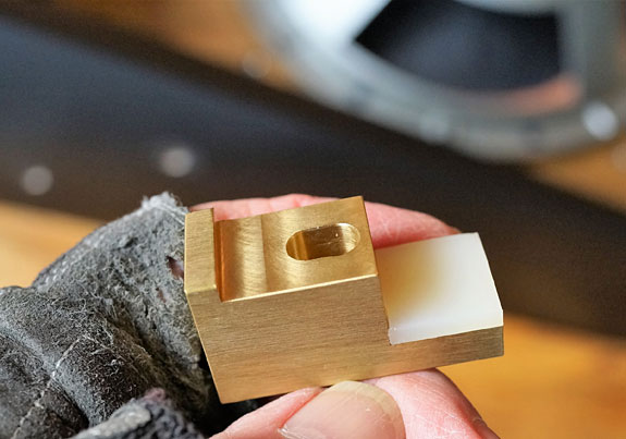 The Atelier Rullit drivers were mounted onto the 2" thick slab of elm with custom machined brass clamps with nylon pads to keep from scratching the painted baskets of the drivers and provide some isolation from vibrations.