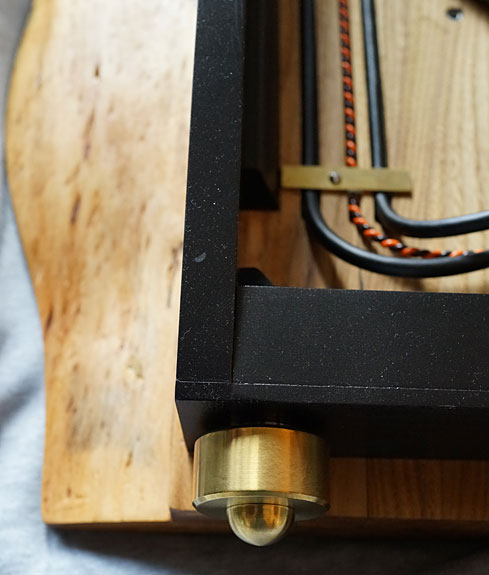 Custom brass footers are attached to the black maple frame that provided additional support for the baffle as well as an attachment point for the legs that gave the speaker four points of contact with the floor. The secure structure provided welcome stability when I had to slide behind them to open and close the honeycomb window shades. Also seen above are the cables that are neatly secured in routed out channels in the baffle. The wiring was very tidy.