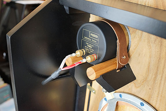 The Fostex T900A super tweeter is simply nested in a wood cradle and held in place with a leather strap. The short wavelengths at such high frequencies are not critical to alignment with the other drivers. This driver crosses over to the full-range Rullit driver at about 14-15kHz with a first-order slope. Closer inspection reveals that round wood dowels upon which it rests are made from PlyBoo, plywood layers of bamboo. The layers are aligned perpendicular to the cylinder so vibrations must pass through all layers, aiding in absorption of micro-vibrations. The black maple blocks support the tweeter even further and are indicative of the attention to detail paid to the design of the entire speaker.