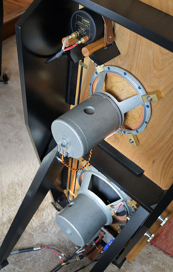 Yes, those are solid copper Cardas binding posts. To their right are the Neutrik power connectors for the electric field-coil magnets for the full range driver and woofer. The small toggle switch below the large silver dial selects a range of adjustment for the gain on the super tweeter. The –10/21 dB position was the one that had any significant effect. And the 11-position silver knob is a Fostex attenuator that provided incremental adjustment to the super tweeter via a 1st order crossover with a single Milflex capacitor. Remember the speakers in the '70s with L-pads on the tweeter? It's back to the future all over again. Rich had set the super tweeter low and encouraged me to only make small adjustments. Being considerably younger than me, I suspect he had no idea how hearing diminishes as people age. For now, let's just say I found this knob extremely important.