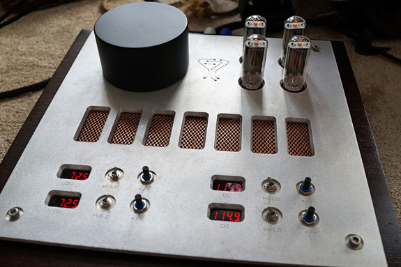 The next item that needs explanation is the tube-powered field coil power supply. Instead of a conventional permanent magnet found in typical dynamic drivers, field coil drivers have a large 'can' at the back end that houses a huge winding of wire, not unlike a transformer, that generates a strong magnetic field when electricity is passed through it. But not just any electricity will do if you're aiming for high-end music reproduction; it must be very clean Direct Current. The field coil is designed to provide a consistently high-powered magnet and the drivers are sensitive to the voltage supplied to them. Changing the voltage will soften or harden the sound and alter the efficiency of the driver as well. Given that the power supply is tube powered, it should be turned on at the start and off again at the end of a listening session to preserve tube life. On one occasion when listening to Hearts of Space on NPR the music was rather annoying which is unusual for this program. Given that the episode was largely electronic music and the quality of the signal sometimes gets disturbed by activity in the ionosphere, I didn't think much of it. Until, that is, I went to shut down the rig and discovered that I had not powered up the field coil power supply. I should have noticed this when I had to adjust the volume higher than usual. With more conventional music you will notice this oversight quickly. You will want to have the power supply where it easily integrates with your start-up and shut-down rituals.