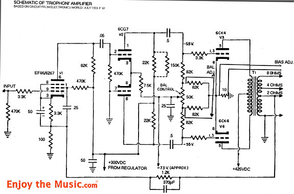 Bias and balance are adjustable and a socket is provided for connection of a voltmeter. Construction is point to point, using star grounding, with AC wiring (in twisted pairs) and ground wiring running close to the chassis. Resistors are metal film where prudent, and coupling and bypass caps are polypropylene. All tube sockets are ceramic. Finishes are commercial grade paints.
