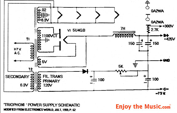 A 6267 / EF86 pentode serves as the input stage. It is of course the low noise, low distortion pentode used in the classic Mullard circuit. The input and phase splitter are regulated by two 6626 / OA2WA gaseous regulators supplying 300VDC +-1%. The choke input power supply incorporates a 5U4GB vacuum rectifier, yielding regulation of raw high voltage of + - 15VDC for a gentle ramp up at turn on. All power supply components are overrated for the puny 50 mA drawn by the 6CK4 tube. The AC line input incorporates a neon pilot light, which flashes when G-d forbid a fuse blows, and an MOV across the mains. The bias supply uses a separate transformer, an ultra-fast diode rectifier and low ESR filter capacitors.