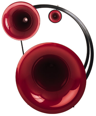 Eye Candy In the main room, a trio of gleaming candy red horns are arranged in a semi-circular Alexander Calder constellation. Although the Trio Classico model measures only 53 inches across, they look as wide as a sofa. A flat black steel tube floats one large, one medium and one small horn in mid-air. Indeed, they are a type of mobile sculpture. They do consist of calibrated parts that move, in response to electronic currents. They are music incarnate. Musical art, which you will either love or hate, for the price of a luxury sedan.