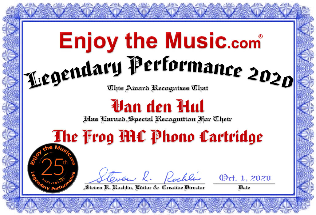 Seductive Sounds But could it rock? A resounding yes! As i type this am playing (flame retardant Nomex suit on) Def Leppard's Pyromania [Mercury 810 308-1] as my wife treated us to a concert featuring Foreigner, Styx and Def Leopard this past weekend. Ok, so an amplified concert is no way to compare vinyl, and of course this album is in no way audiophile, but it doesn't stink either. Even with this inferior, non-audiophile vinyl pressing there was a hard rocking yet pleasant sound. Maybe this cartridge should be nicknamed 'The Gentleman's Choice'? Moving to audiophile favorites, the must-have and incredible Cisco Music 180 gram release of Greig's Music From Peer Gynt [LSC-2125] will easily show off what a system is capable of! With Suites Nos. 1 and 2, plus Lyric Suite Op.54 for good measure, here we have Arthur Fiedler conducting the Boston Pops Orchestra. This Living Stereo release showed just how good The Frog can sing, from the very quiet and alluring moments to full-on orchestra, it is all there to be enjoyed. With such a great performance it demands a great system, and the Oracle/Frog combination does not disappoint. This record is simply one of those must-have items. Harmonics had a sensational balance without being overly warm. Perhaps a small touch warm, yet never veiled by the proverbial rosy-color glasses. Everything from the subtle changes as the triangle is struck to the plucking of the stringed instruments, The Frog simply dances and sings along. Section (stringed, brass, etc.) are reproduced with great clarity, while the ebb and flow of dynamic shading are easily discernable. Bass instruments are appropriately full and tight, with the hall sound filling things out not just around and behind my loudspeaker, but well into my listening room. Soundscape junkies take note, as Van den Hul's The Frog will immerse you in room filling sound. This is perhaps the deepest front soundstage my vinyl rig has reproduced, while width was properly large. This enabled musical instruments/grouping to be placed within their proper location with ease. Expansion into the room was also of reference quality, so lovers of Q-sound Roger Waters Amused To Death [Sony Music 468761 0] will be in heaven! Classical music lovers will enjoy hearing various groupings of stringed section come alive from their proper space, with a layer of horn instruments next and eventually the percussion section at the rearmost of the stage. If you use this cartridge and have a soundscape problem you had better look elsewhere in your system. PRAT lovers take note as The Frog, in combination with the Oracle Delphi MK V turntable with Oracle-SME 345 tonearm, balances perfectly between boogie and playing 'on the fours'. On Analogue Productions' Art Pepper Meets The Rhythm Section [APJ010], his saxophone is right there as Philly Joe Joes' drumming sets the back beat. Meanwhile Paul Chambers' bass walks the beat. Of course i have to mention how Red Garland's piano playing dances all around the beat, playing with those ever-important small cues of timing that makes him a legend. Major gripes? Well, none really. Minor ones would be that the uppermost range could use a touch more extension while inner resolution falls a tiny touch short. Other than that, i'd leave everything else as is and bask in the glory of an ease, smoothness, and excellent harmonic balance. Of course this is why Van den Hul offers upper end cartridges (at higher prices naturally). Yet for a cartridge that began at $2500 over two decades ago and now (in 2019) retails at $3519.19, if you do the math of inflation and the continuing downslide of the dollar versus Euro/Pound, the price today in comparison is downright reasonable.