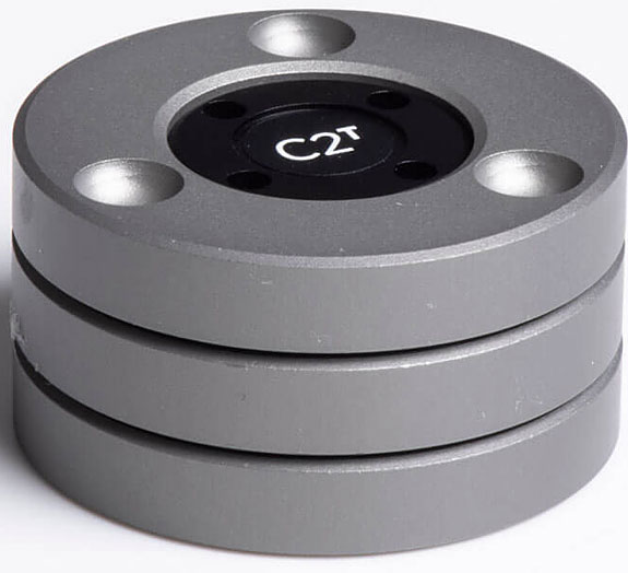 Further, their diverse lineup of Ansuz resonance control isolation devices, designed as component footers, are called Darkz. A single Darkz footer measures 1 ¾" wide and just shy of an inch tall and is comprised of a layer of three discs. Each disc has three dimples - spaced equidistant (every 120°) - on its top and bottom surface and is separated and isolated from the one above or below by the use of three small metal ball bearings, residing in and held in place by the disc dimples. Moving through the Darkz lineup, you move to more and more effective isolation materials, including titanium and zirconium.