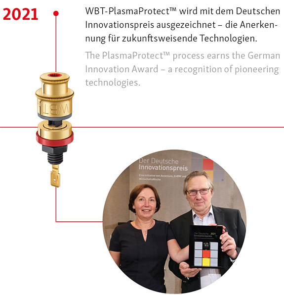 2008 – Plastic Injection Molding: Developing internal production capacities bolstered their control over quality and precision. 2018 – PVD Surface Treatment: The integration of state-of-the-art Physical Vapor Deposition techniques further underscored their commitment to advanced manufacturing processes. 2019 – PlasmaProtect Technology: WBT pioneered a proprietary process that applies ultra-pure gold to copper under vacuum using PVD. This technique not only enhanced connector performance but also garnered the prestigious German Innovation Award in 2021, highlighting the blend of technical progress with audiophile passion.