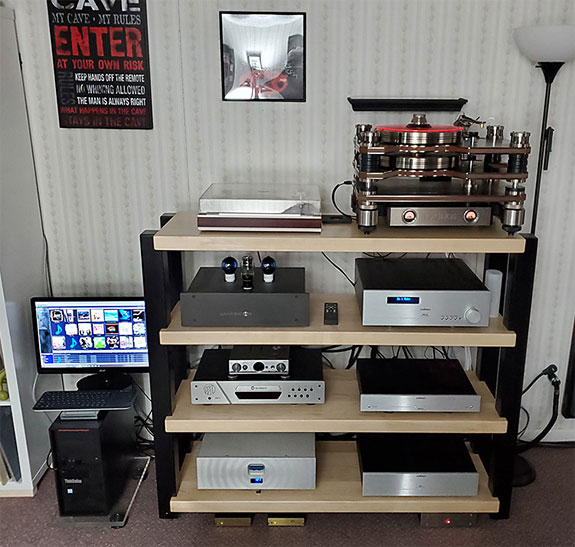 Because I began programming in 1971 while a sophomore in high school, and just recently (November 2021) retired as IT Engineer/Analyst who is certified on both Microsoft and Apple platforms, I've chosen to build my own Windows based PC as a file server/Streamer. I started with a Lenovo ThinkStation P320 CAD Workstation with an Intel Xeon 3.50GHz quad core CPU running 8 Logical Processors, with 32 GB RAM, and I use a Samsung EVO Plus solid-state drive for the OS. The computer is further optimized for playing music by using Fidelizer 8.8, an installed optimization utility that allows leveraging, managing, and prioritizing a computer's core functionality, services, and processes. My primary streaming and music management software is Roon 1.8, but I also employ J River MediaCenter 28. The stream is transferred from my Media Server to my two DACs by means of a STEALTH USB-Select-T (a tunable USB cable!) to my Lampizat0r Baltic 3, or an Audience frontRow USB cable to my iFi Pro iDSD DAC with outboard iPower Elite Linear Power Supply. Given the way most DACs see DSD files, I have found USB connectivity to be the most effective overall. Files are then served over Buffalo LS220D 12TB Network Attached Storage system using a sonically chosen Cisco router system and all Audience Hidden Treasure Ethernet CAT7 cable, and I have installed the Hidden Treasure SATA cables inside the Workstation. But even that is overkill. I just did it because it was so bloody affordable for me as an IT Geek. The tweeters of my Von Schweikert Audio ULTRA 9's are centered 1' 10" from the sidewalls, and 7' from the wall behind them, with a toe in of about 8 degrees. The prime listening area is centered roughly 12' back from the plane of the tweeters. This placement puts the back of the markedly deep enclosures, and their unique-to-the-industry, room-integrating rear-firing Ambience Retrieval System, 4' 10" away from the front wall. The ULTRA 9s, at just over five hundred pounds each, have a sensitivity of 92dB/W/m, a remarkably stable 4-Ohm nominal impedance, and offer an in-room frequency response of 16Hz to 40kHz. With their internal 1000-Watt mono amplifier and the fully integrated suite of controls for their rear-mounted 15' subwoofer (you can control amplitude, crossover frequency, and fully variable phase, from 0 to 180 degrees), combined with my Audionet Max monoblocks output of 700 Watts into 4 Ohms, gives me some 3400 Watts of power. Not only does this mean that my system will likely never run short of current or clip, but it means that I can measure my system's output in horsepower! Since 745.7 Watts equal 1 horsepower, I have just a tad under 4.6 horsepower! In addition to the native positive attributes of my listening room mentioned above (dimensions and Aperiodic venting), further room taming is achieved with the use of RoomTunes Corner Tunes, two Echo Tunes (one each at the tweeter's primary reflection points on the ceiling), and the surprisingly effective Shakti Innovations Hallographs. Two 6-foot-tall by 4-foot-wide panels of Auralex Studio foam Wedgies provide absorption (and a bit of diffraction as well) at both the first and second side-wall reflection point for the speakers. And while the subtly perceptible contributions made by the Shakti Innovations Hallographs are significantly more apparent in smaller or irregular shaped rooms, in my larger room now (46' by 13'), they don't have the same impact on tonality, but they do still shed better illumination into the rear-most corners of the soundstage. So, if you are buying used, or getting a great deal, they are worth a try. I think that they provide enhancements that you cannot duplicate any other way. Power to components in the listening room is fully dedicated, with a separate 20-Ampere service run from the panel for the amplifiers (main audio and subs), and another separate 15-Ampere service run for the sources and other electronics. All other devices on that level of my home (computers, lights, printers, televisions, heating/AC, etc.) are on separate, isolated circuits. At the time the new services were run, I also had the whole home grounding system redone, including the installation of new grounding rods, in order to both comply with the current National Electrical Code standards of achieving A resistance of 25 Ohms or less, and so as to not introduce any unnecessary noise into the power delivery system, in an attempt to provide the highest degree of sonic accuracy possible, ensuring the blackest of backgrounds, improving the pace, rhythm and timing, and painting a wider, deeper, and taller soundstage, including better separation of vocals and instruments. Those who know me (or have read my work over the years) know that my system MUST be tonally accurate, strikingly neutral, stunningly transparent, and jubilantly musical. However, open, detailed, and layered soundstaging, combined with realistically sized and spatially accurate images, are every bit as important to me as truthful timbre and musical bloom. With the right recording, this system whisks you back to the venue or hall of the original performance for a spooky-real recreation of that event in the here and now. I have had any number of audiophile and musician visitors' remark on the power of the listening experience as witnessed from my chair. Musicians from any number of genres of music, from Salsa to Rock 'n' Roll to Classical, have actually wept after or during a listening session, and audiophiles of many years have remarked things like, "What more could you ask for," and "I've never heard a rig sound any better than this." While those are encouraging words, and seem to indicate that I'm doing the right things with component and cable selection as well as room set up, my system (every system" ;-D) must be seen as an ongoing work-in-progress. Every once in a while, the addition of some new piece, be it a source, a cable, or an accessory, allows me to move just a little closer to that actu