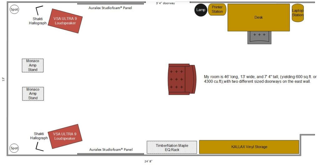 Music Room Some quick calculation reveals the room is about 600 ft2 or some 4300 ft3. Based on room length, it can support full development of frequencies down to about 24Hz, with primary axial resonances at about 44Hz and 78Hz. But the room is amazing sounding, and exhibits remarkably little loading. In fact, during a visit to install and set up my Von Schweikert Audio ULTRA 9 loudspeakers, Leif Swanson, Chief Designer at Von Schweikert Audio said, "You seem to have some pretty cool things taking place with the room. Good length for the bass waves, and those doorways. I notice very little change to the bass walking around the room. You definitely scored with this room."