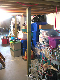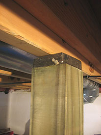 Floors My idea was to plant a pillar beneath each loudspeaker that would conduct much of the vibration directly to the concrete floating slab in the basement. Luckily, the loudspeakers were not directly above the washer and dryer. I had originally thought about one of those adjustable steel pipe models that go for about $30 to $40 each at Home Depot. Being the cheapskate that I am, I went for Plan B, which was to wedge a pressure treated 4x4 into place with a sledgehammer. To put some icing on the cake, I used a proprietary vibration absorbing material between the 4x4 (inch) and the stud beneath the speaker. I measured the distance and had the post cut to length at the Big Orange. Since it was nearby, I only bought one for $8 and change in case the improvement was insignificant. With the beam hammered into place I went upstairs and compared the reinforced loudspeaker with the other one, switching the speaker cable so I would be listening to the identical channel from each loudspeaker. Keep in mind that I had recently reached a new peak with the window treatments mentioned above.