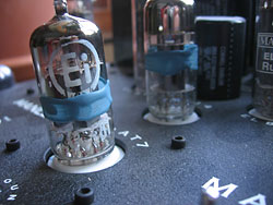 Blue Tube Goop With the encouraging success of the window and floor treatments, I reached for the bottle. The application instructions made it sound like a cure-all medicine. I revisited Accentus Audio and re-read the product info, industry reviews (except the ones in Chinese) and analyzed the photos. From the photos, it looked like some people had been given liters of this stuff to paint their equipment. The AVM washes off with water when still wet, but must be scraped off-like, with a razor blade - when dried. I opted for the conservative approach of painting a half-inch band around the mid-section of the small signal tubes of one of my Manley Labs Mahi monoblocks. I thought about testing it on Albert Von Schweikert's $22,000 VAC Phi Beta, but it had to be returned before I could finish the testing. Just kidding, folks!!!