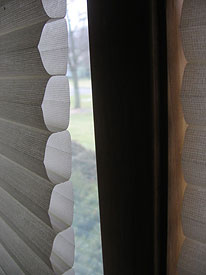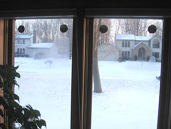 Ron Hedrick suggested that I needed to treat all six windows for optimum benefit. I positioned a circle of Dynamat in each corner, about two inches from each edge as illustrated on the Marigo Labs website. I peeled the waxed paper off the black sticky side and carefully oriented the circles so the printed abstract designs that were part of the Dynamat labeling created a quasi-Zen-like artistic symbol. Hey, sometimes you have to work with what you've got. Plan B is to paint them to match the walls. The black tacky material sticks tenaciously to the glass and is hardly noticeable from the outside of the house unless you're looking for it. If necessary, the circles can be removed with a razor blade and any slight residue should come off with a solvent such as the bug and tar remover you use on your car.
