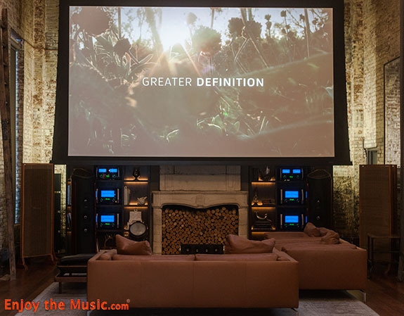 The system was fitted with the latest flagship turntable from Pro-Ject, their Signature 12, which sports a high-gloss metal platter and flywheel belt-drive arrangement. The components of the system were all Audio Research, which included the Reference 250SE monoblock amplifiers, the Reference 3 phono preamp, and the Reference 6 linestage. The Kraftwerk album sounded fantastic on this system. Around the halfway point of the leadoff track, "Die Roboter" ("The Robots"), others who worked at the World Of McIntosh entered the room, wondering what music was playing on this system that produced this phenomenal sound quality. They might have initially been drawn into the room because we were playing this album rather loudly, but this setup had no problem reaching a very high volume with absolutely no strain. As the music got louder, the bass reached deeper, the highs became even more sparkling and attractive, and the midrange became even more captivating. Lastly, we returned to the main room at World Of McIntosh. While I was there the 16-foot cinema screen was in its raised position, so I didn't see it at all. Instead of a screen I saw a wall of McIntosh equipment, flanked by a pair of McIntosh's flagship XRT2.1K speakers. There was no turntable set up in this room at the time, so instead my host and I sat on the comfy couch while he selected tunes from TIDAL on his iPad wirelessly connected to the McIntosh MB50 streamer connected to a McIntosh D1100 digital-to-analog converter. We listened to quite a few selections, and even though most of the selections were plain old CD quality 16-bit/44.1k resolution, it was clear that not only did the speakers in the room have no peers that I was aware of, I have no doubt that the excellent sound was also due to them being fed by McIntosh's mighty MC2KW 2000-Watt monoblocks and C1100 reference tube preamplifier.