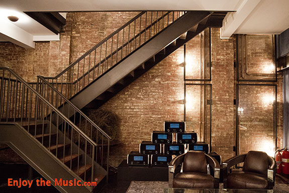 When I walked into the unmarked entrance at 214 Lafayette Street in New York I was met by the bright blue meters of a stack of about a dozen large powered McIntosh amps.