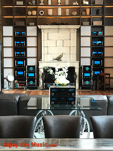 There is a McIntosh/Sonus faber system with a 14 speaker Dolby Atmos surround sound system, which can also be fitted for a live band or DJ, but also easily adapted for two-channel listening. When I visited in this room the main speakers were McIntosh's flagship, the $130k XRT2.1K.