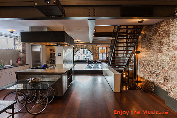One floor up after passing the pool I was in the kitchen area, which overlooks the main listening/theater room, furnished by Design Within Reach and Fontana Arte, a video display by Digital Projection and Stewart Filmscreen.