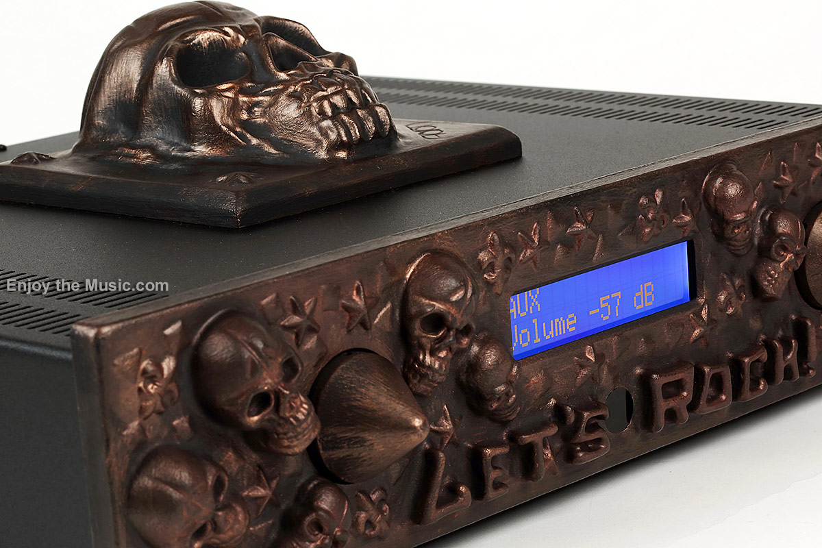 Perhaps it is because most music lovers are extremely conservative, and yet also extremely individualistic at the same time. Sometimes they are reflected in a longing for something "different". Both Mr. and Mrs. Höhne apparently gave their best, because the Aaron Let's Rock integrated amplifier has a very telling name. Let's Rock! sports the kind of finish that would be perfectly at home within a "mancave" of any self-respecting rocker. You need not be all inked up, yet perhaps you're dressed in leathers and sleeping within them by your motorcycle. In order not to be too fulsome with changes, the amplifier has a classic shape overall. Let's Rock!'s front panel is, however, a relief with skulls, stars and fleurs-de-lis. To leave the customer with little doubt about what Aaron intends for the overall styling, the top panel features a huge skull bolted directly onto it, which looks like it has just been nicked from some historic cemetery.