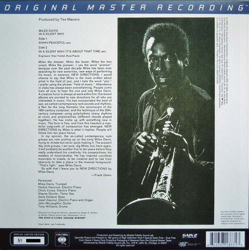 Miles Davis' 1969 album In A Silent Way was his first foray into what many consider his "electric period," after which his million-selling album Bitches Brew was released. By chance, when I was a teenager, In A Silent Way was the first "electric" Miles Davis album I ever purchased. I've gone through many pressings of this great album. I've even listened to an excellent sounding original Columbia 'Six Eye' pressing on my system. As good as this pressing sounded, this 1969 pressing was improved upon in 2012 when Mobile Fidelity Sound Labs released In A Silent Way on numbered, 180-gram vinyl.